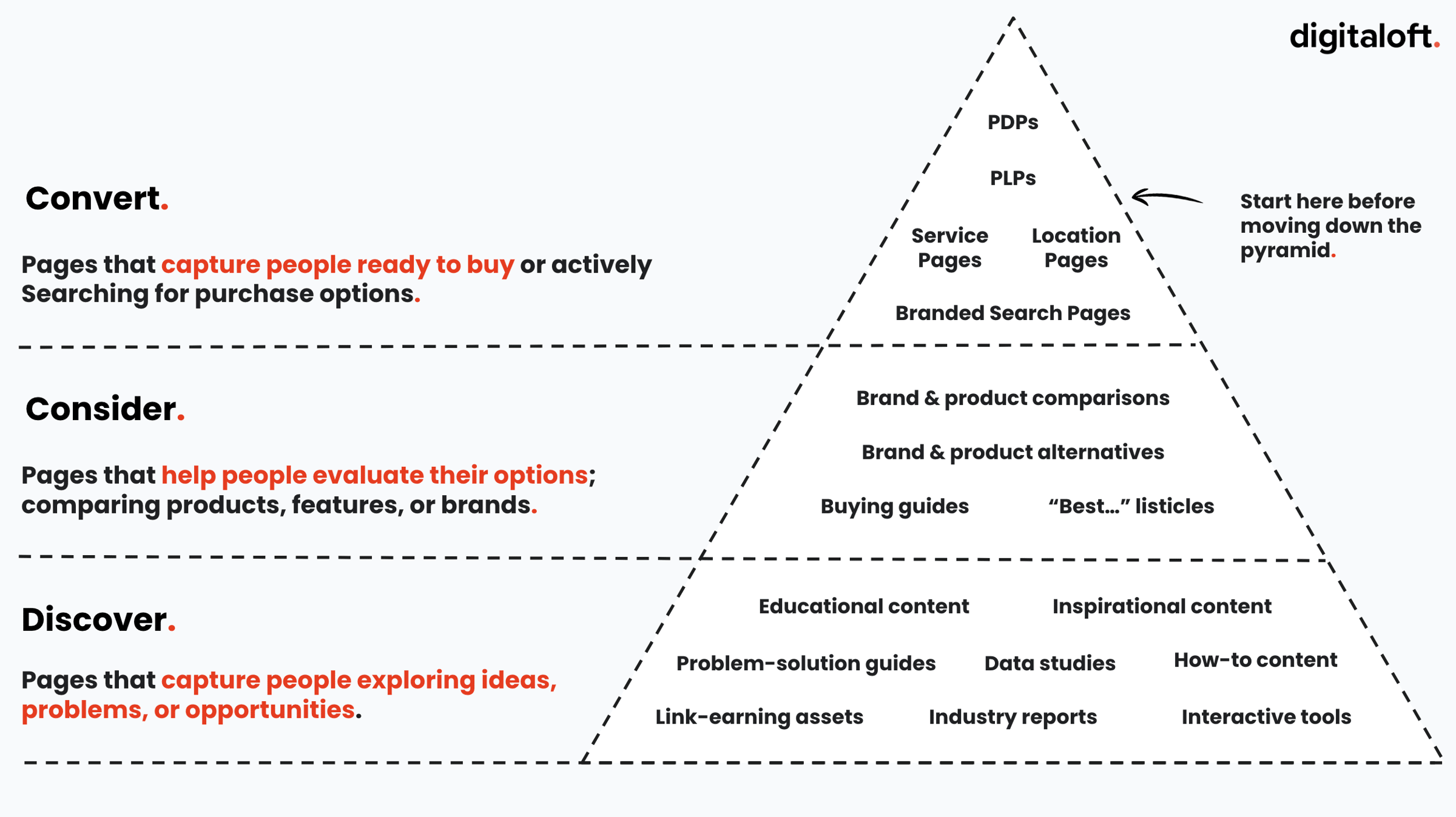 That is, get all your conversion content in place across a category you're focusing on before moving down to consider and discover content.