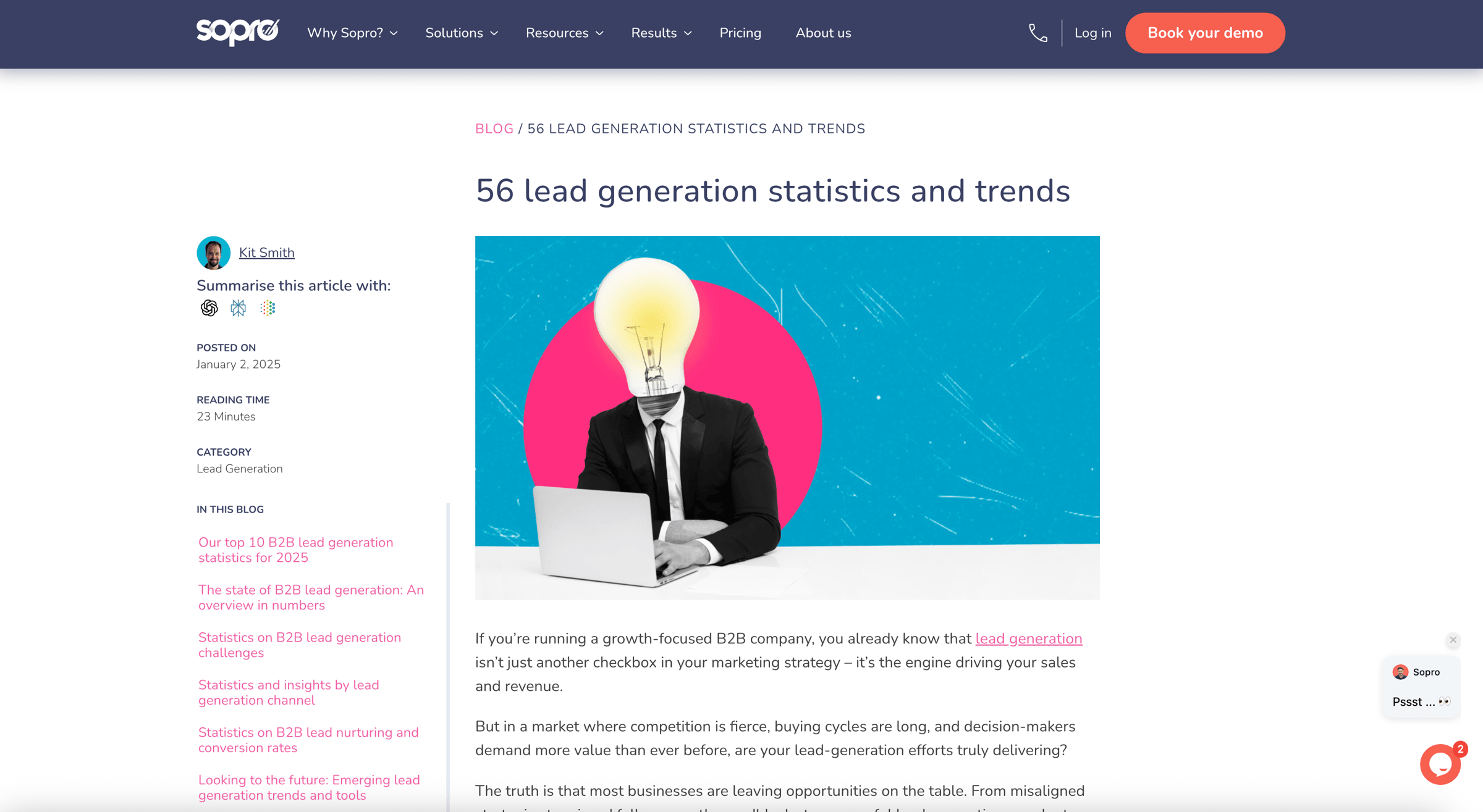 Our 'lead generation statistics' content for Sopro rounds up 50+ stats and trends for the sector, with the majority of these being the brand's own data.