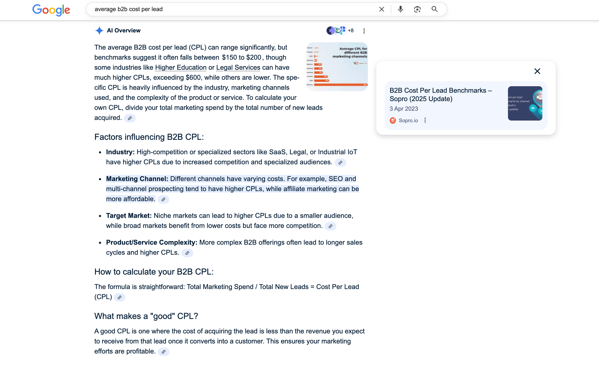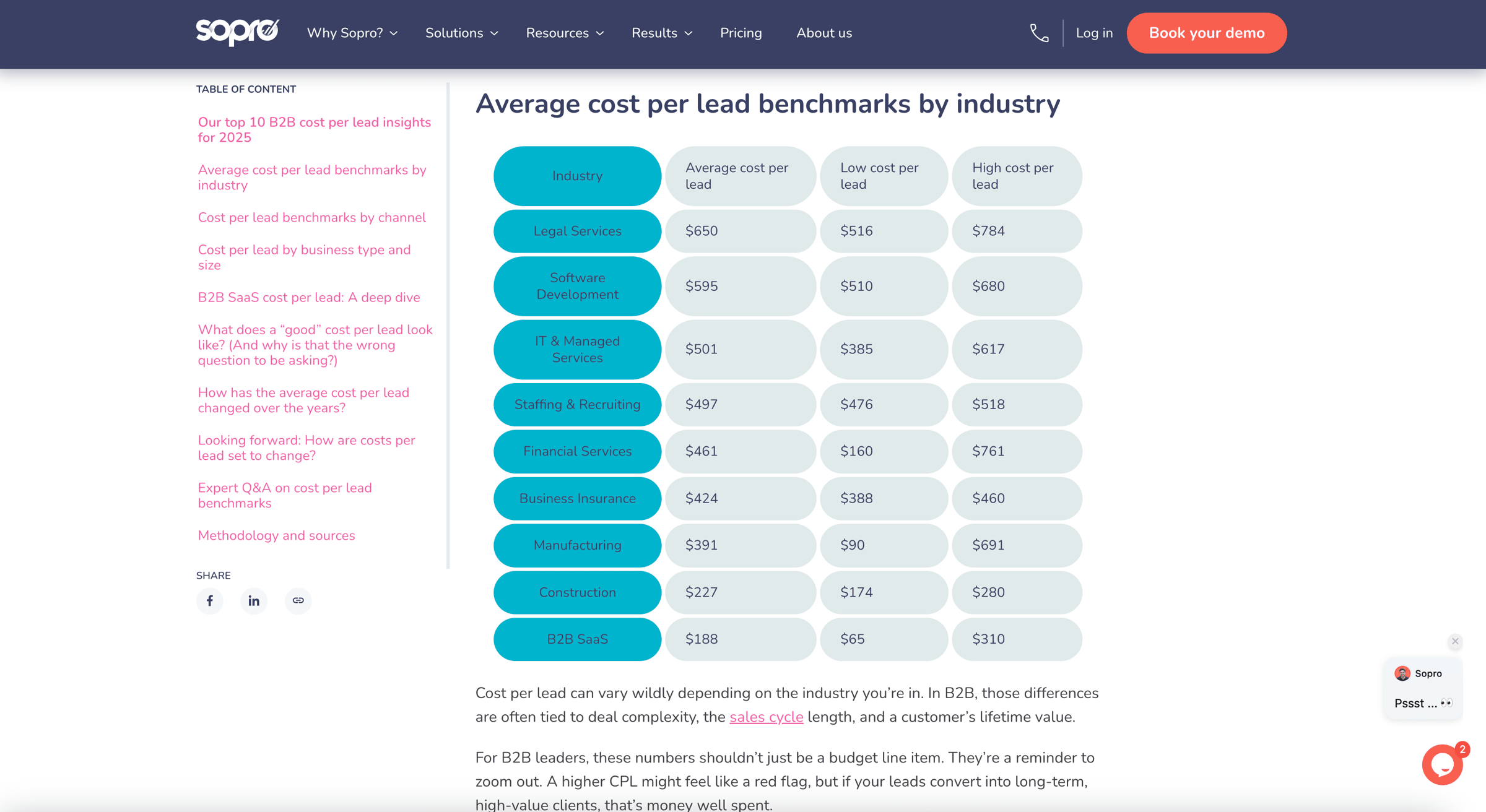 For Sopro's 'B2B Cost Per Lead Benchmarks,' we update the content annually based on data from the brand's own State of Prospecting report.