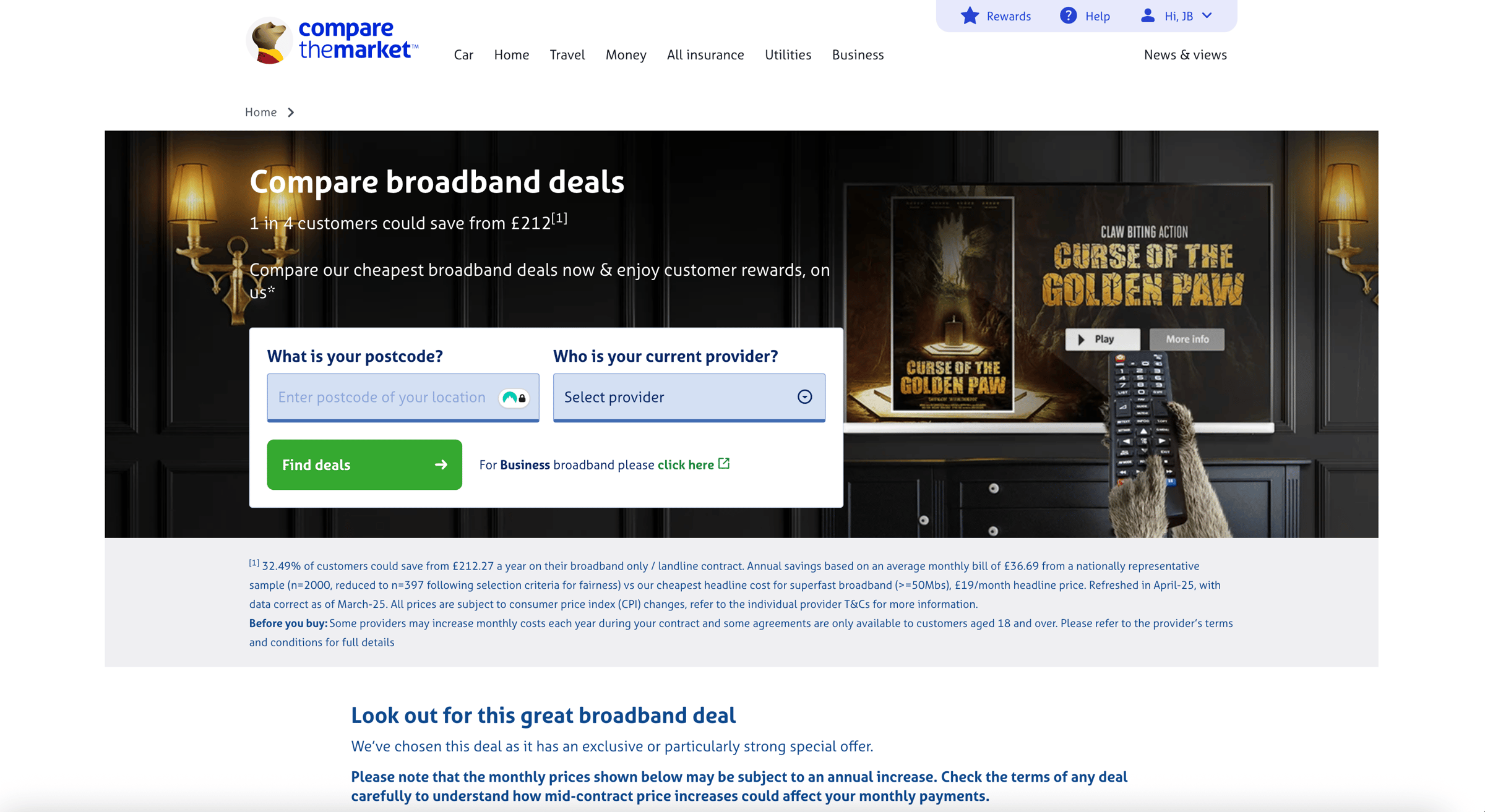 Compare the Market uses it's own data on the 'compare broadband deals' page to highlight how much customers can save... right at the top of the page.