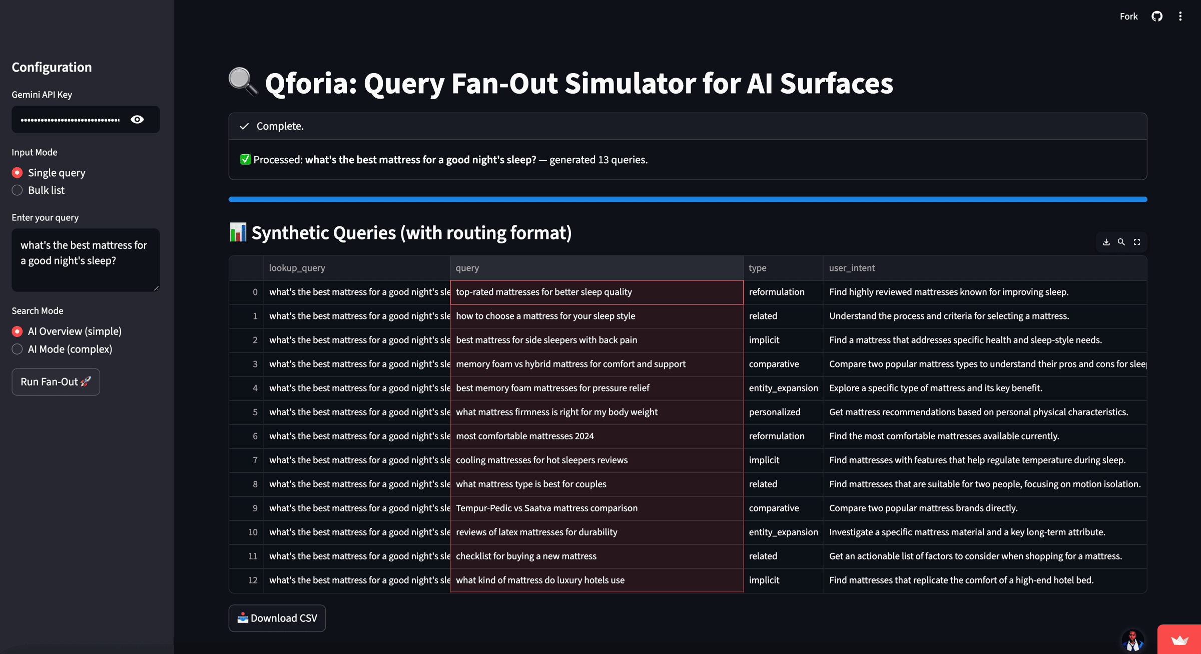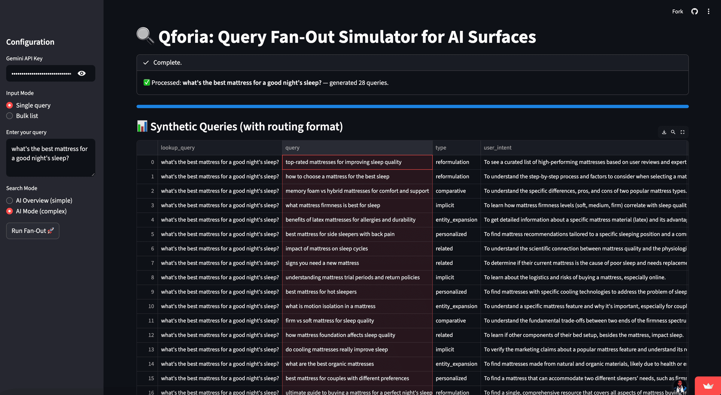 Here's a query fan-out simulation for "what's the best mattress for a good night's sleep?" using the 'simple' AI Overview mode.